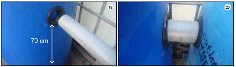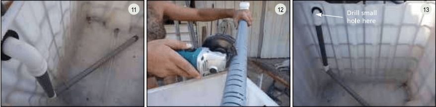 Positionnez une courte longueur de tuyau PVC (50 mm) à travers le joint uniseal et placez-y un coude PVC (50 mm) qui descend vers l’intérieur de l’IBC. Vous rattachez ce coude à l’extrémité de la longueur verticale (11).
