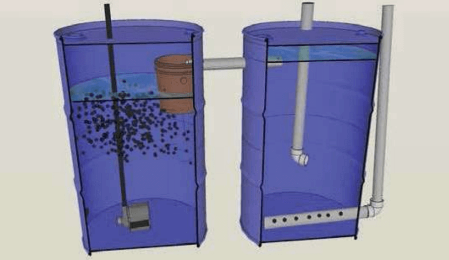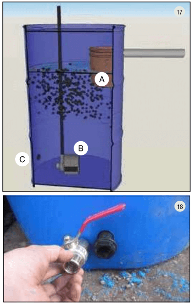 Prolongez le tuyau de sortie du réservoir à poissons jusqu’au fond du filtre mécanique (à environ 30 cm du fond du tonneau).