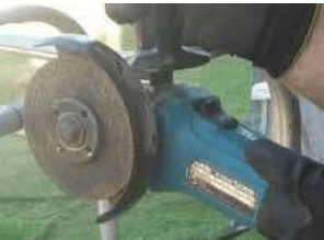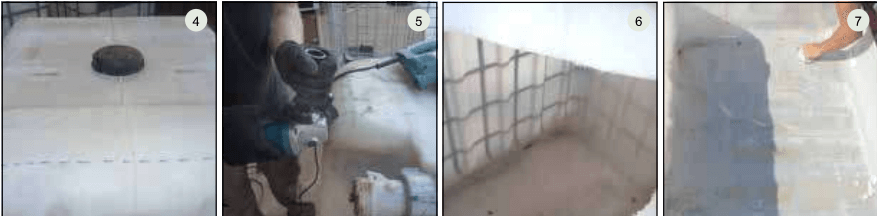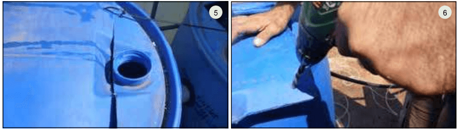 Ensuite, avec la meuleuse d’angle, découpez l’intérieur du carré (5) afin d’ouvrir votre réservoir IBC et retirer le dessus (6).