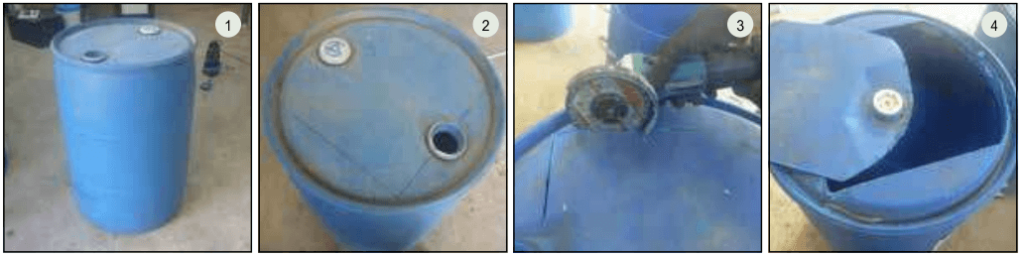 Prenez deux barils/tonneaux (200 litres) (1) et découpez le dessus de chaque tonneau comme sur les illustrations ci-dessous (2-4) à l’aide de la meuleuse d’angle.