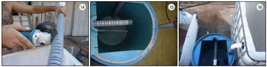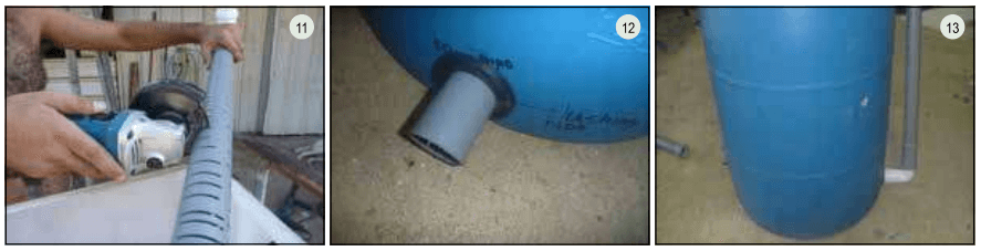 Le tuyau PVC (50 mm) qui est placé horizontalement au fond du réservoir doit être coupé partiellement avec des fentes d’une largeur de 2-3 mm. Utilisez la meuleuse d’angle (12). Cela permettra aux particules solides d’être aspirées par le tuyau tout en empêchant les poissons de sortir.