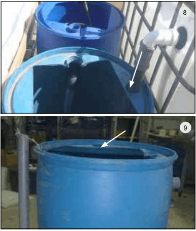Percez un trou (50 mm) à l’aide du foret à cône de 50 mm sur la surface supérieure du baril et faites y passer le tuyau de sortie du réservoir de poissons (8-9).
