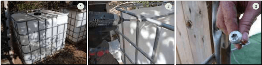 Retirez les deux barres métalliques du haut de la cage qui encadre le réservoir IBC (1) afin de libérer le réservoir IBC.