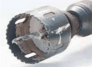 Sur un côté de votre réservoir IBC vous tracez l’emplacement de votre évacuation d’eau à 12 cm du haut et 12 cm du bord le plus proche (8). Vous percer un trou avec la scie à cloche (diamètre 57 mm).