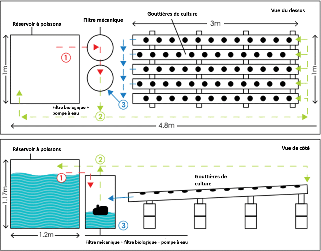 3) En bleu, la circulation de l’eau des gouttières de culture NFT vers le filtre biologique.