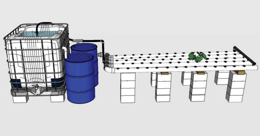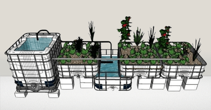 Le système que je vais vous décrire fait environ 2 000 L avec un réservoir à poissons de 1000 L et une surface de culture de 3m² 👇.