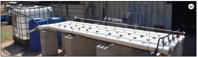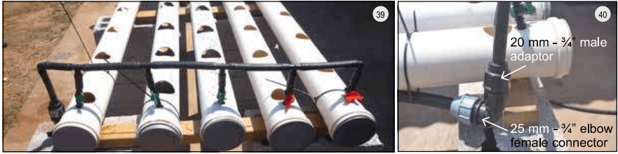 Fixez ce tuyau (25 mm) au coude PVC femelle (25 – 19 mm) vu dans l’illustration n°40, qui alimentera en eau chaque gouttière NFT (44).