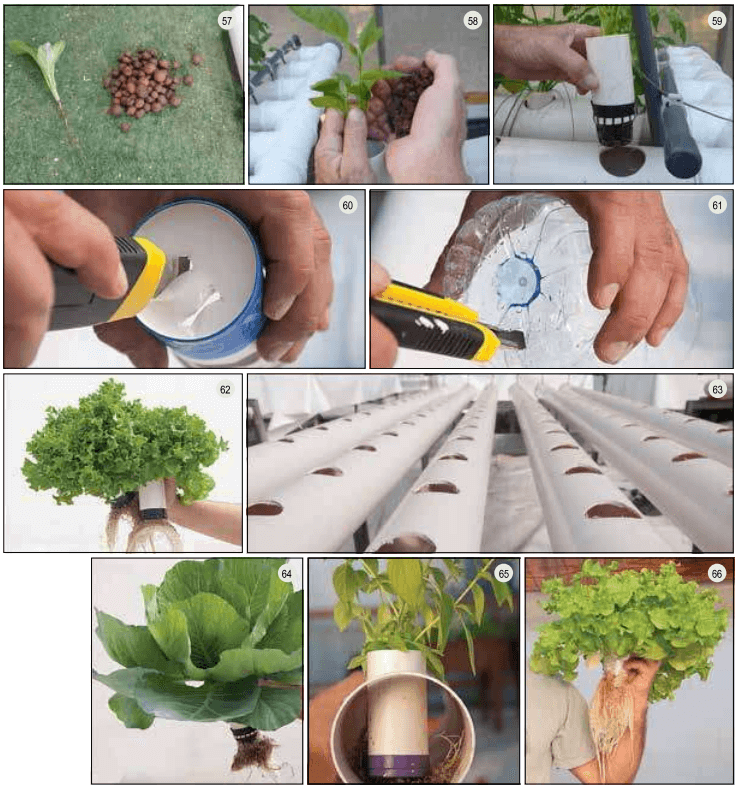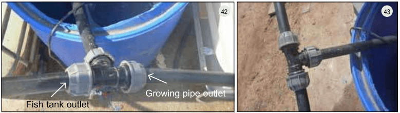 Placez un connecteur PVC « T » (25 mm) à l’extrémité du tuyau pour permettre de diriger l’eau vers le réservoir de poissons et les gouttières NFT (42-43).