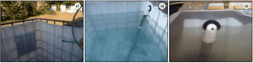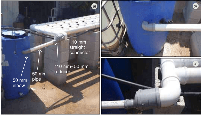 Utilisez un tuyau PVC (50 mm) pour connecter le coude (50 mm) au réducteur (110-50 mm), pour permettre à l’eau de s’écouler des gouttières NFT vers le biofiltre (36-38).