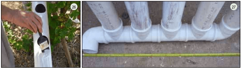 Prenez un coupleur PVC droit (110 mm) et fixez-le au dernier coude PVC (110 mm) de la gouttière NFT (illustration n° 27), qui est fabriquée avec une série de connexions PVC T (110 mm).