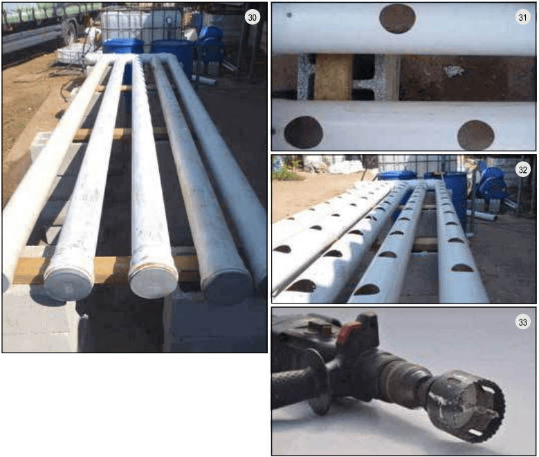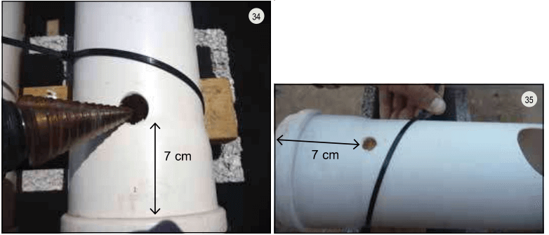 Enfin, percez des trous de 20 mm avec le foret à cône, à 7 cm de l’extrémité des gouttières (du côté où vous avez placé les bouchons). Ce sera l’arrivée d’eau de vos gouttières NFT (34).