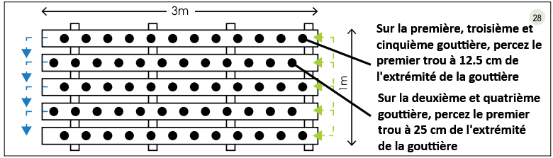 Pour un espace de croissance optimal de vos plantes, suivez le motif triangulaire montré dans les illustrations n° 28 et 31 en alternant la position des trous entre chaque gouttière.